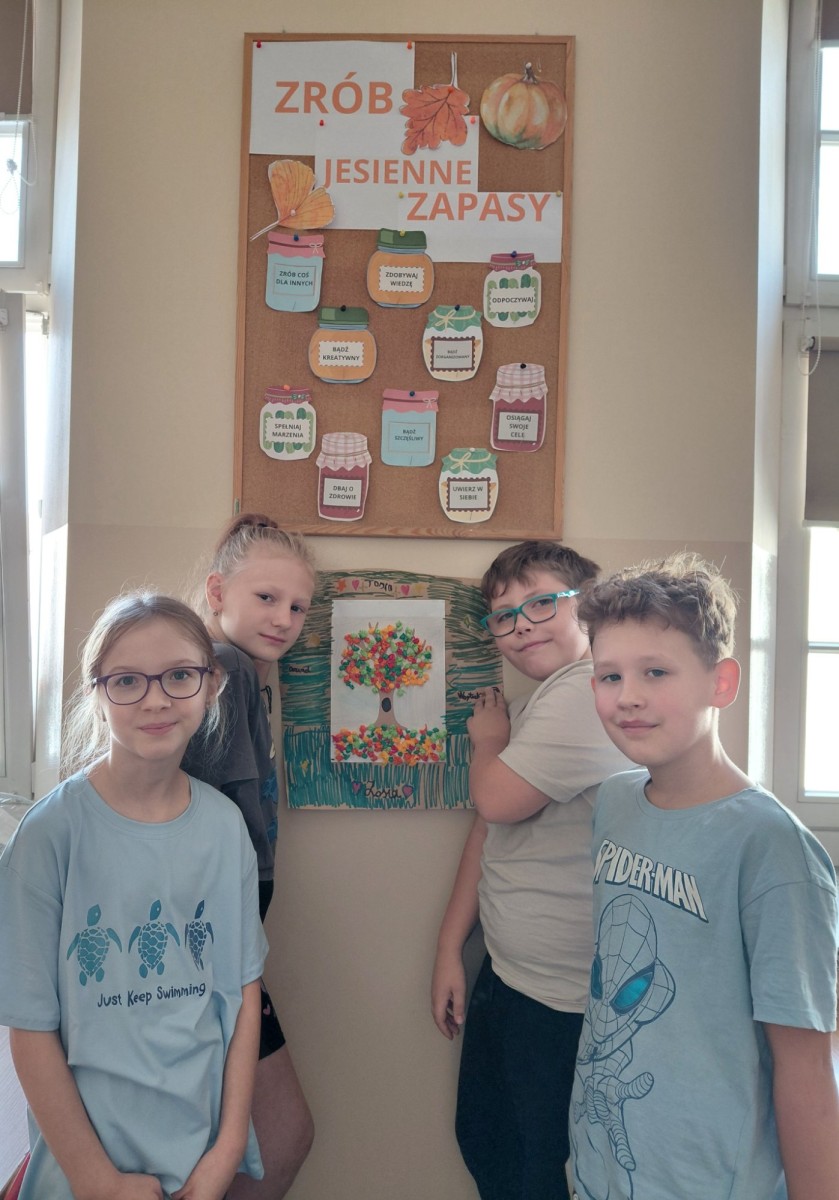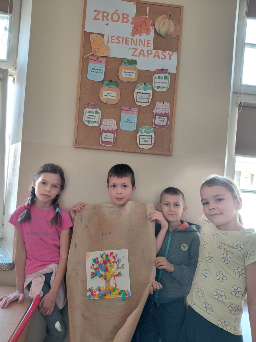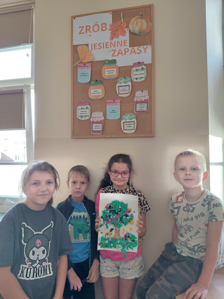 Na zakończenie dzieci podjęły się pracy plastycznej w grupach. Ich zadaniem było wykonanie jesiennego drzewa. Każdy pracował z ogromnym zaangażowaniem, a efekt końcowy pokazał, jak wiele potrafią osiągnąć razem.