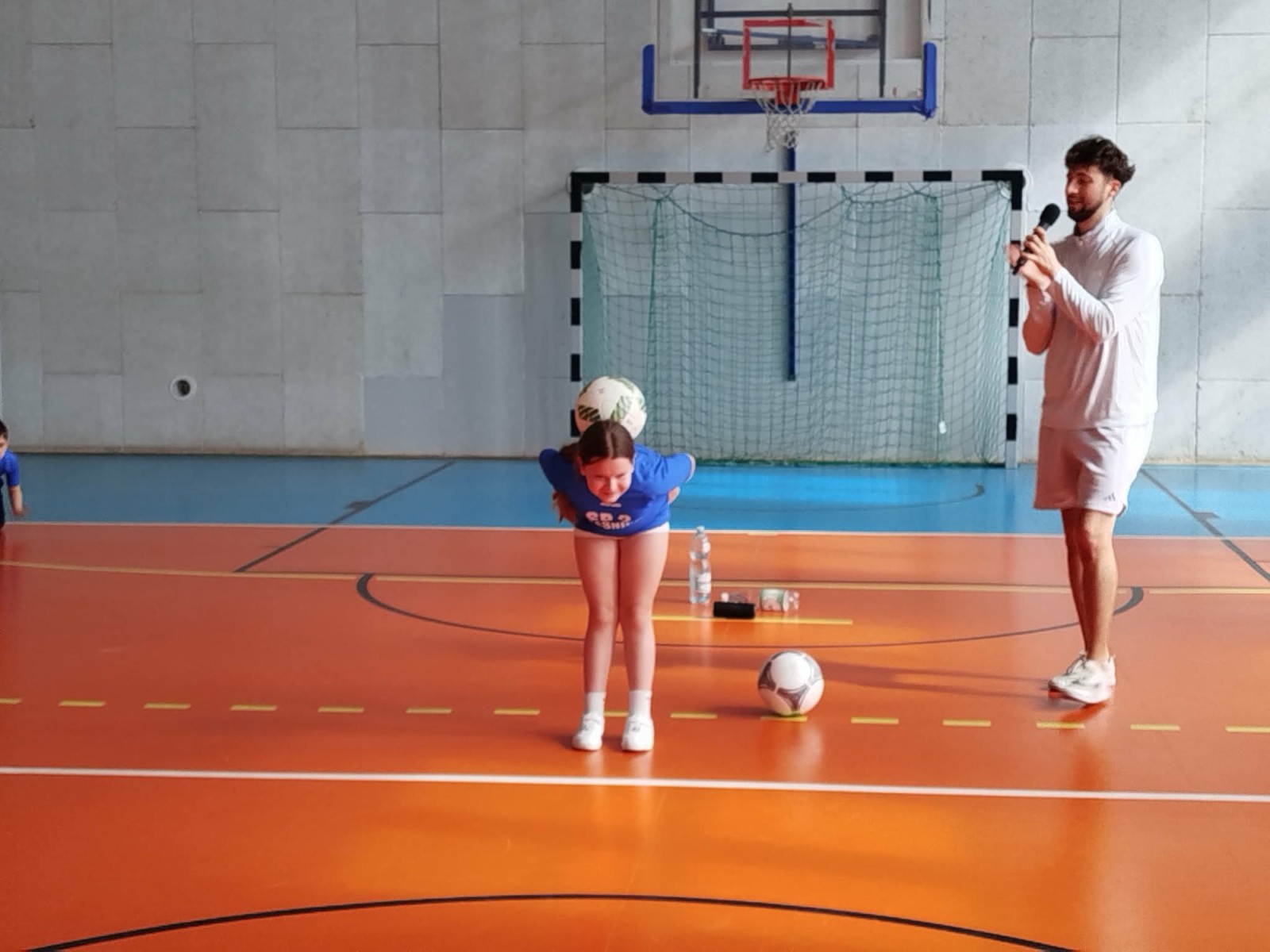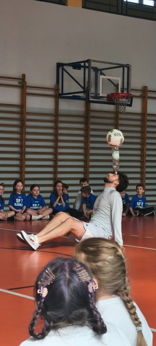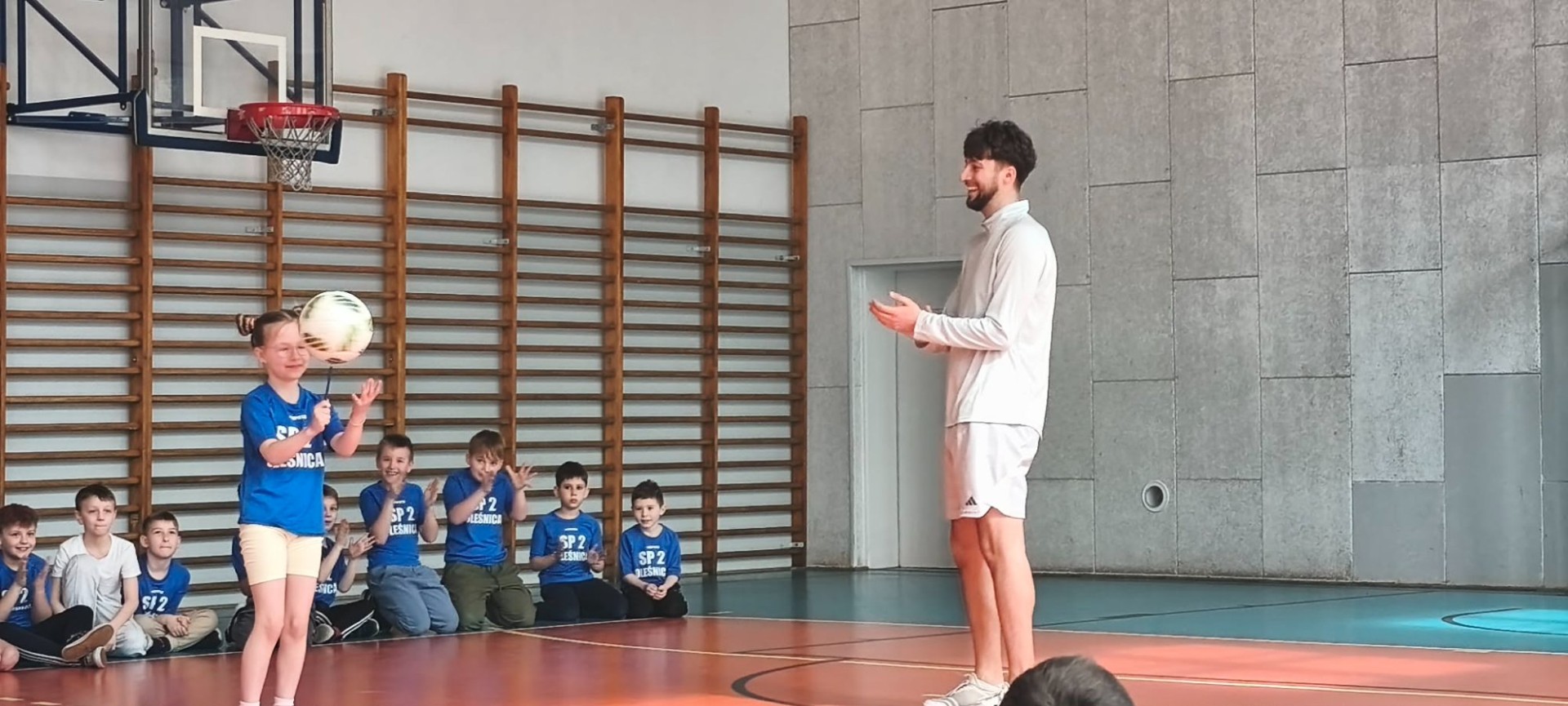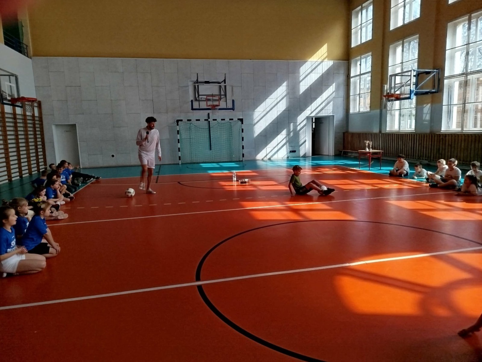 Po pokazie zawodnik przeszedł do części praktycznej. gdzie pod jego okiem uczniowie próbowali min.:okrążenie piłki nogą w powietrzu, utrzymanie piłki na karku, przełożenie nogi nad piłka podczas żonglerki. Zawodnik cierpliwie korygował błędy, podkreślając ,że w tym sporcie kluczowa jest systematyczność i praca nad własnymi słabościami. Lekcję zakończył wspólny konkurs "kapkowania" oraz rozmowa z zawodnikiem. Uczestnicy mogli dowiedzieć się, jak zacząć profesjonalne treningi oraz jak Maciej przygotowuje się do ogólnopolskich zawodów. Lekcja z Maciejem Leją była dla uczniów inspirującym doswiadczeniem. Pokazała,że dzięki wytrwałości można osiągnąć mistrzowski poziom, a freestyle football to doskonała forma aktywności łącząca sport z kreatywnością.
